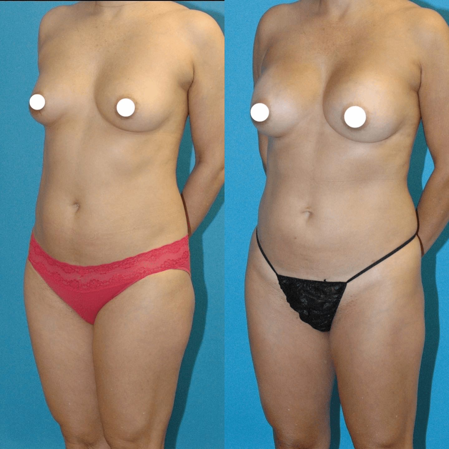 This 48 year old female disliked the smaller appearance of her breasts. She also wanted to improve the appearance of her abdomen and thighs. She was treated with a breast augmentation using a 310 cc smooth round silicone implant. She also had tumescent liposuction of the upper and lower abdomen, and inner and outer thighs. Her post op photos were taken six months after surgery.