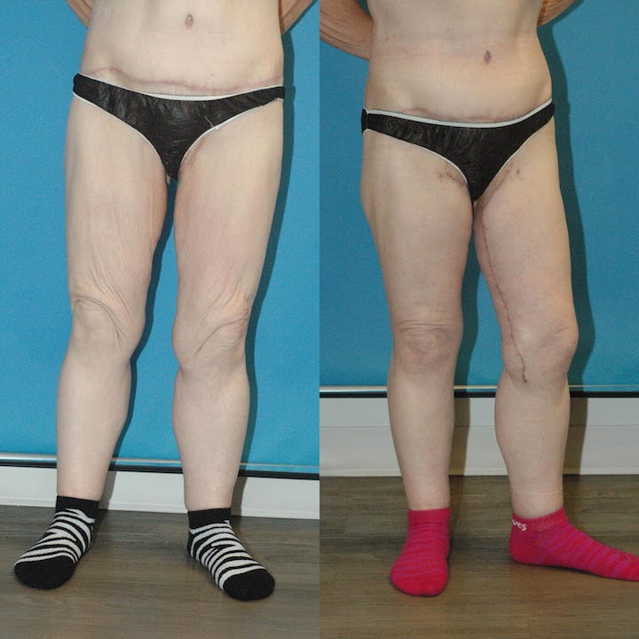 After losing a considerable amount of weight, it can be quite frustrating to have stubborn and unwanted skin remaining around the thigh area. Many patients that inquire about thigh lift surgery come to our Board Certified Plastic Surgeons with concerns of unsightly and/or “saggy” skin, hoping to restore a natural contour that compliments their figure. The primary focus for thighplasty is to remove excess skin, though simultaneous liposuction is often recommended for improved aesthetic results. The surgery can last up to a couple of hours in our accredited surgery center while the patient is under general anesthesia. Scar appearance will continue to improve throughout the healing process, however, most patients are able to return back to work and exercise within a week!